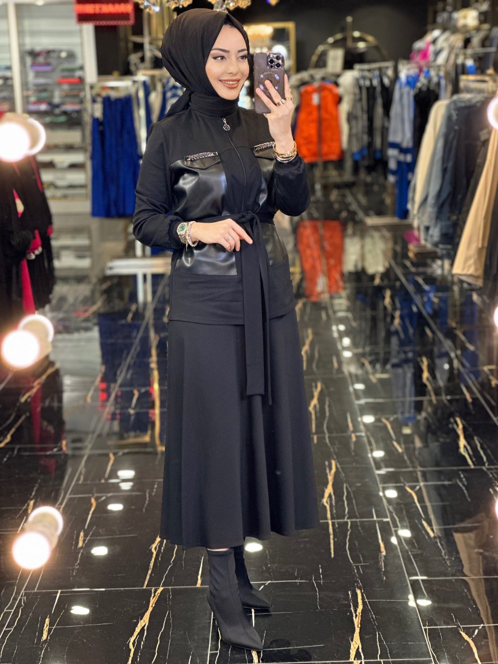 02-1939 Ön Deri Parçalı Fermuarlı Takım Siyah