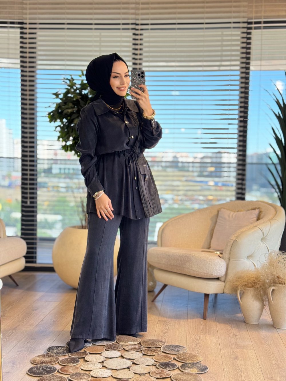 02-2652 Sağ Tarafı Kırışık Kumaşlı Takım Siyah