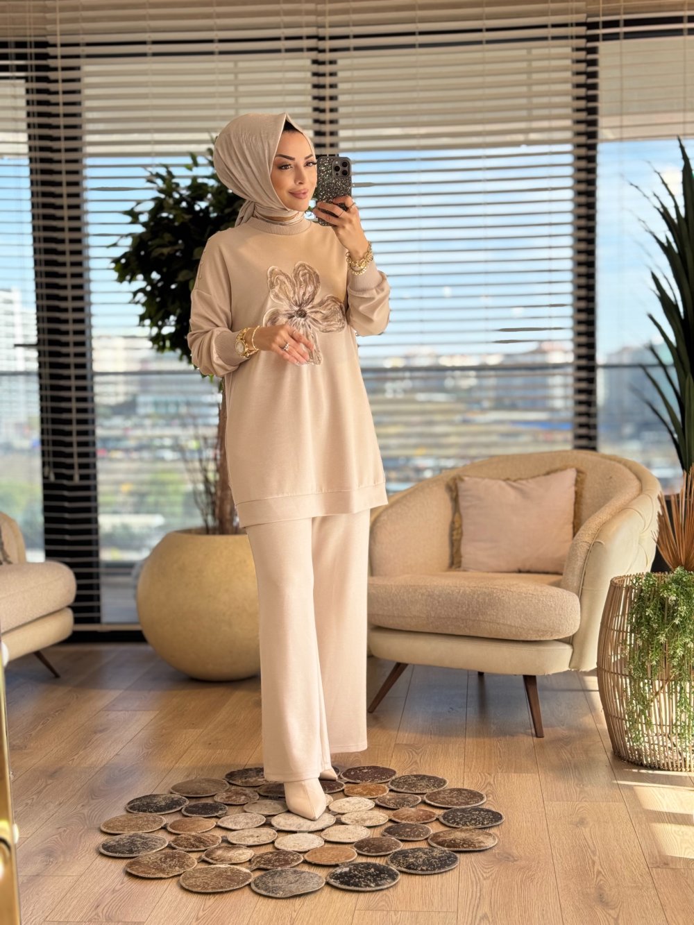 02-2698 Ön Büyük Çiçek Nakışlı Takım Bej