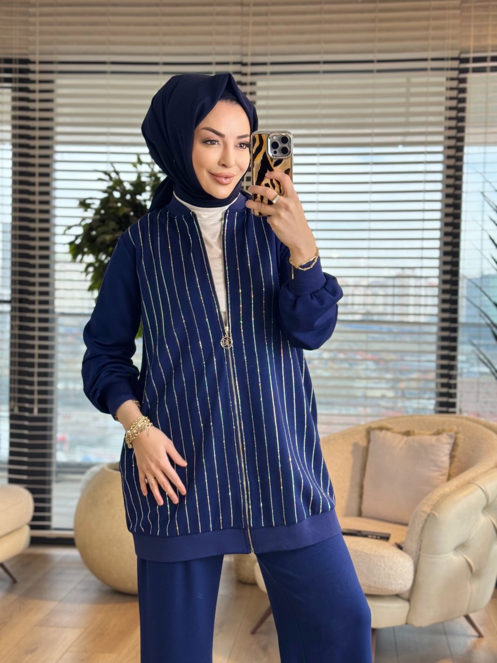 02-2726 Ön Boyuna Taş Baskılı Takım Lacivert