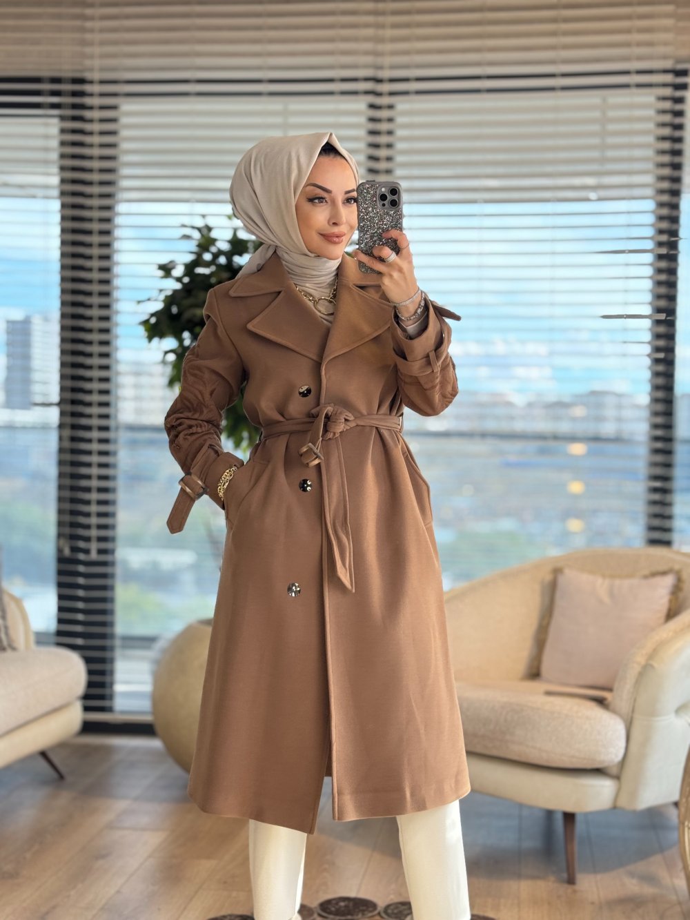 06-1125 Kolları Nakışlı Kaşe Kaban Camel