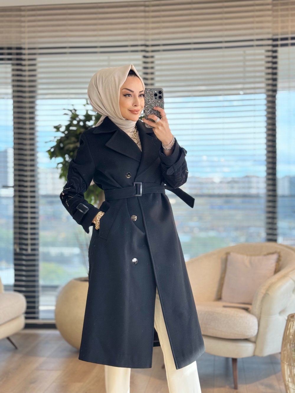 06-1125 Kolları Nakışlı Kaşe Kaban Siyah