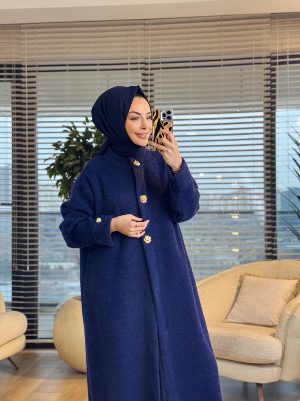 080 Angora Patı Ve Manşeti Düğmeli Kap Lacivert