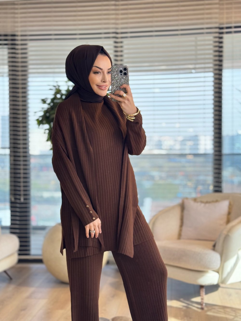 10017 Kolları Düğmeli Şallı Triko Takım Kahve
