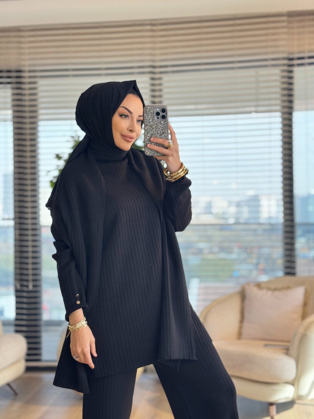 10017 Kolları Düğmeli Şallı Triko Takım Siyah