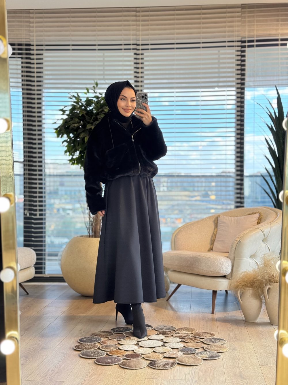 1005183 Kısa Kapşonlu Kürk Mont Siyah