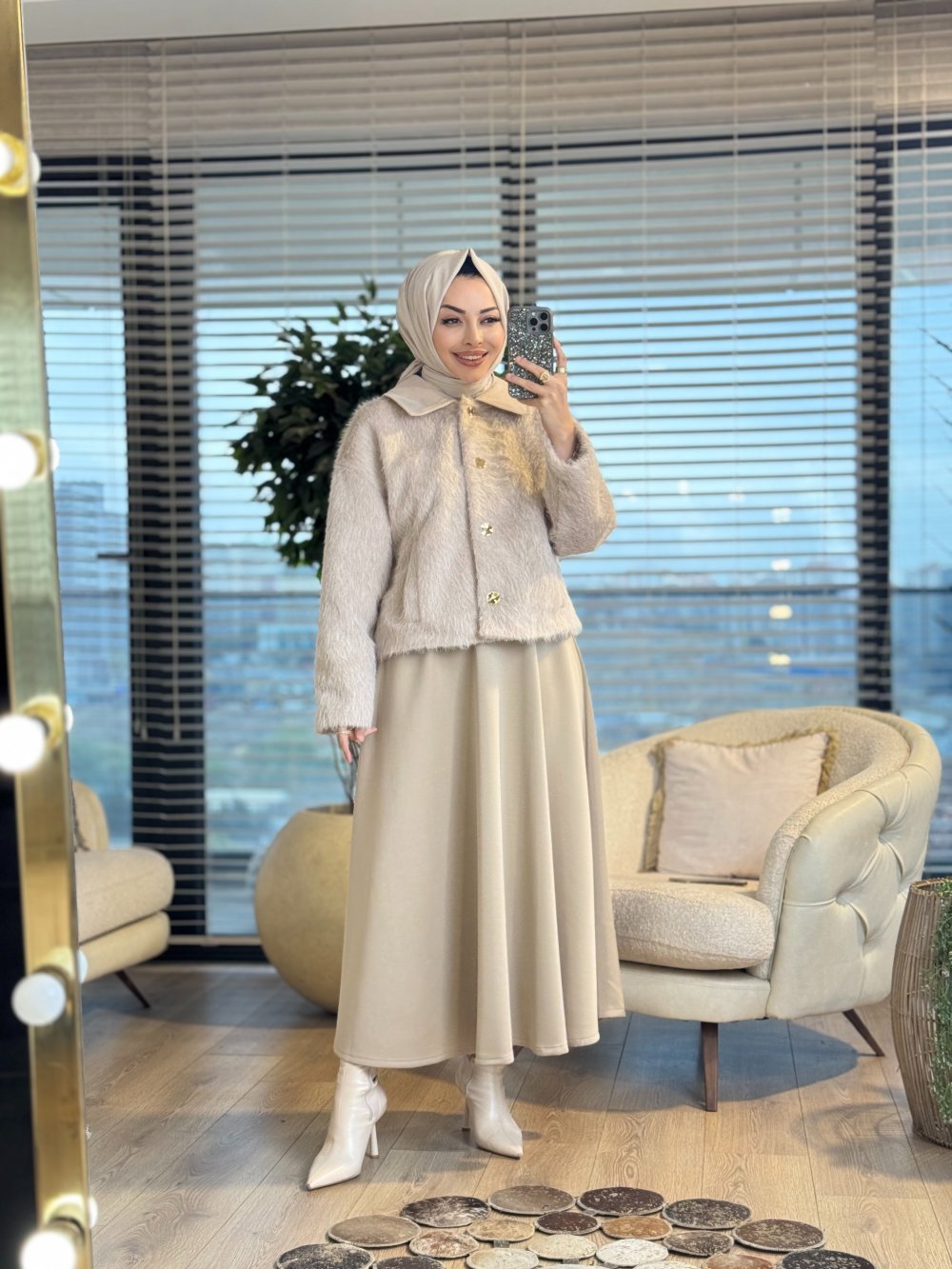 1005393 Kadife Yakalı Kürk Ceket Bej