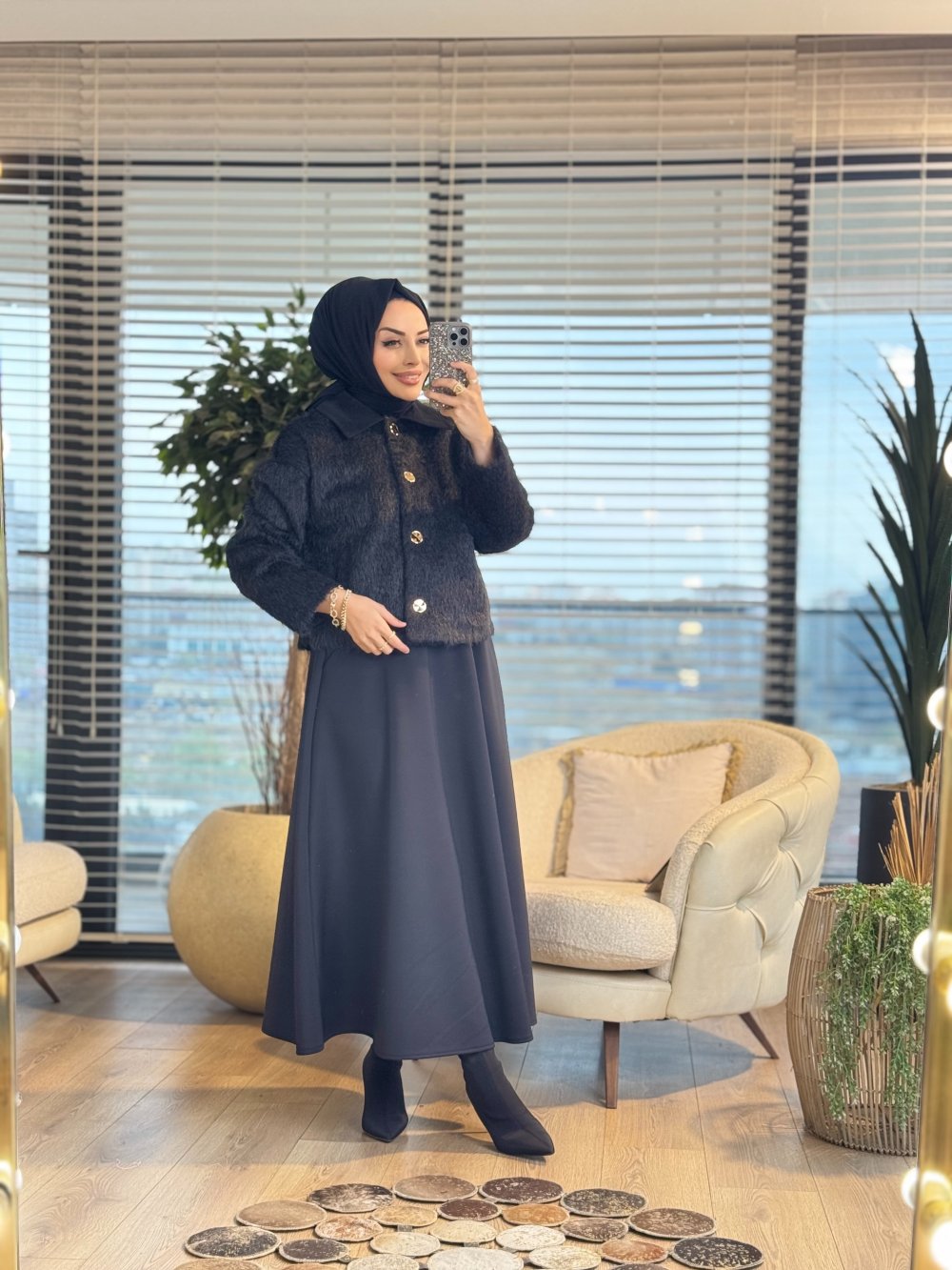 1005393 Kadife Yakalı Kürk Ceket Siyah