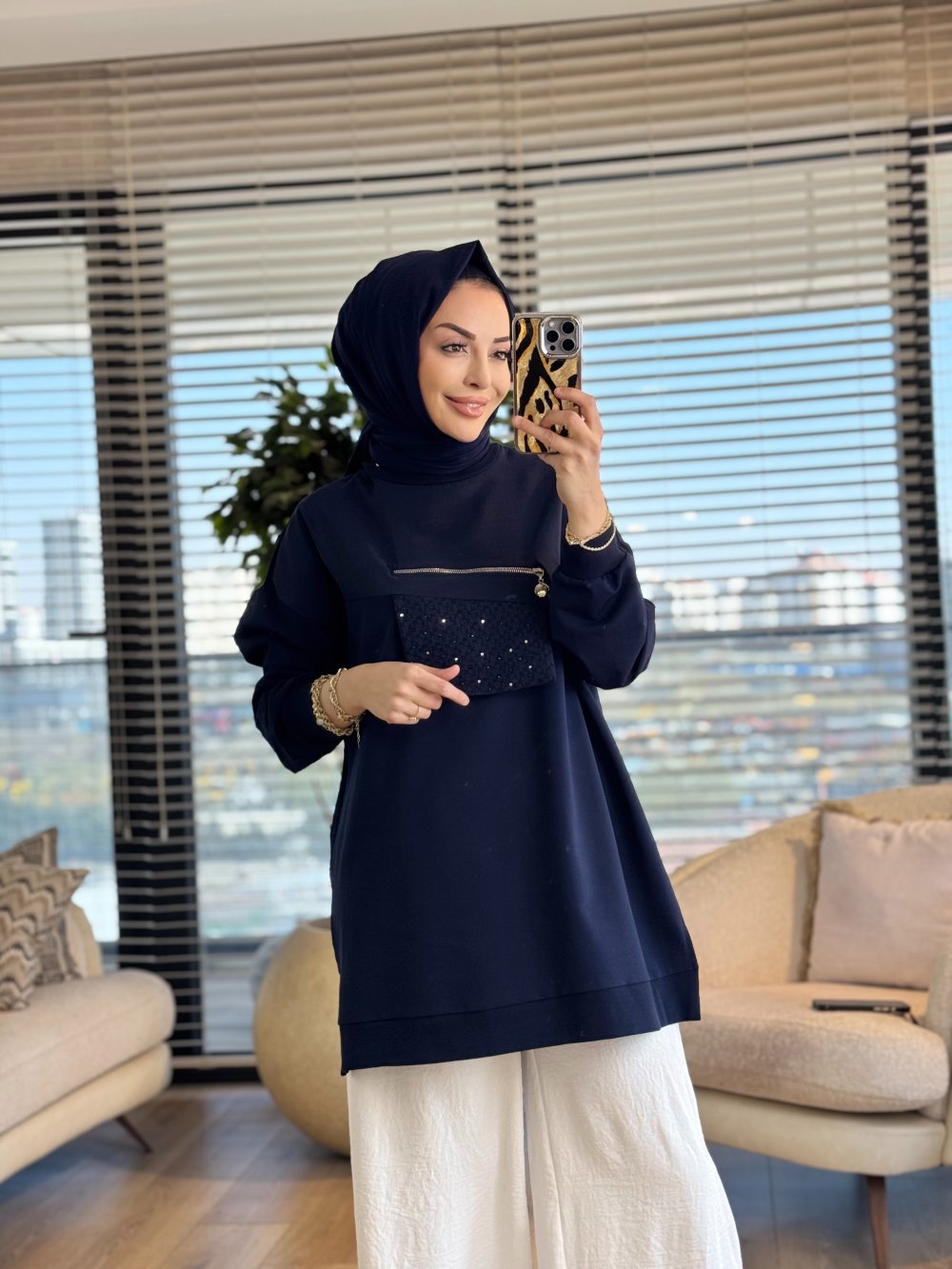 10768 Ön Parça Ve Fermuar Detaylı Tunik Lacivert