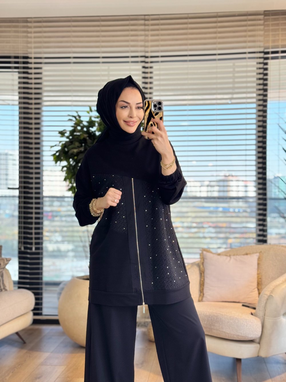 10679 Önü Petek Desen Parçalı Fermuarlı Tunik Siyah