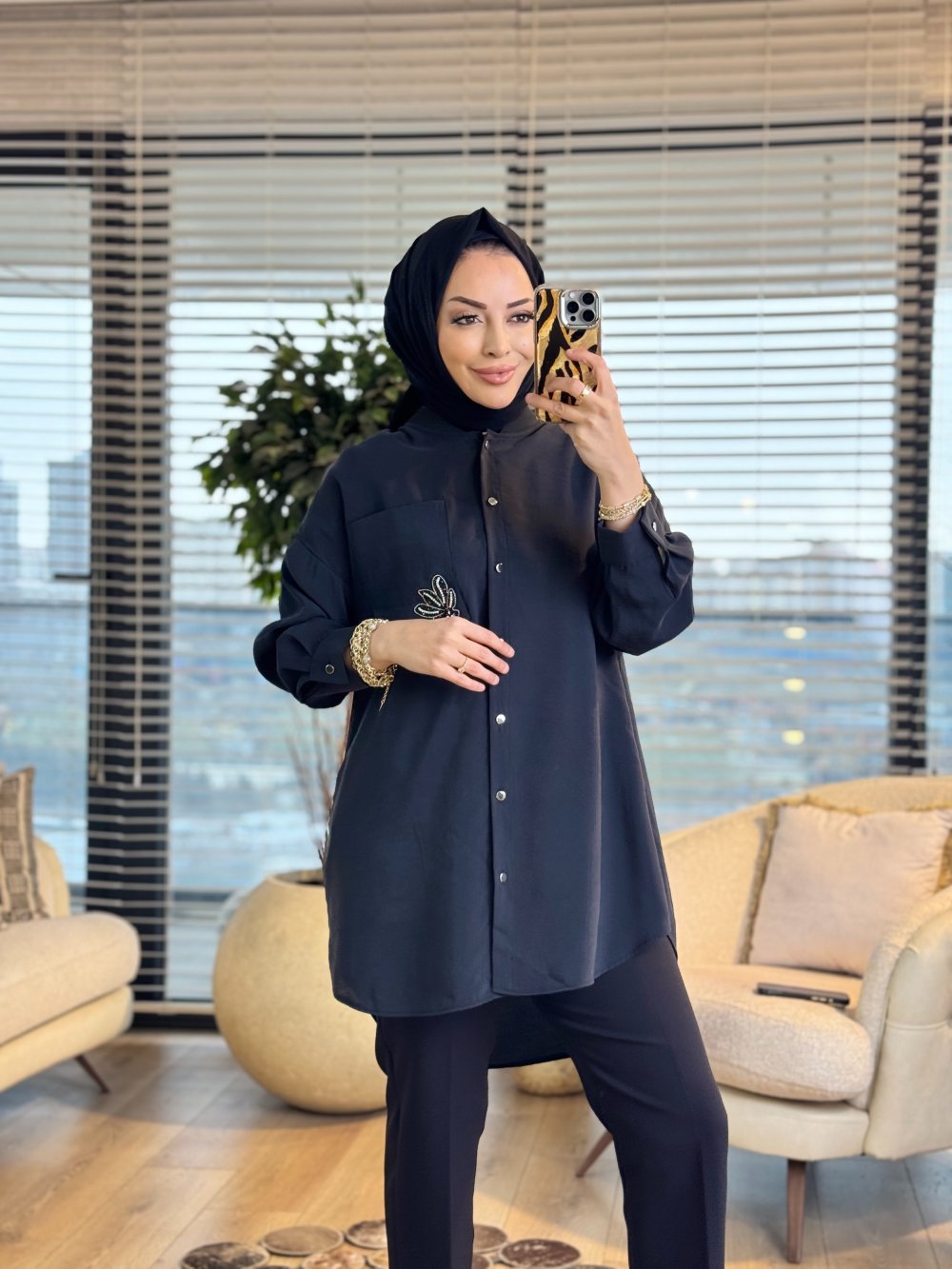 10763 Cep Üstü Broş İşli Gömlek Siyah