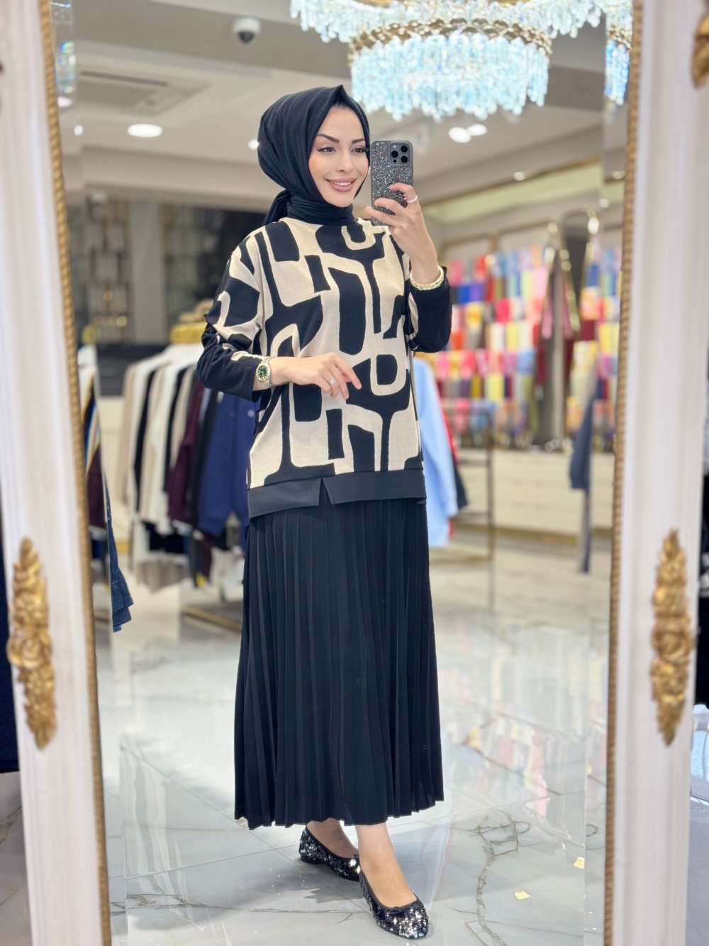 11130 Üst Geometrik Desenli Pilise Etekli Takım Siyah Bej