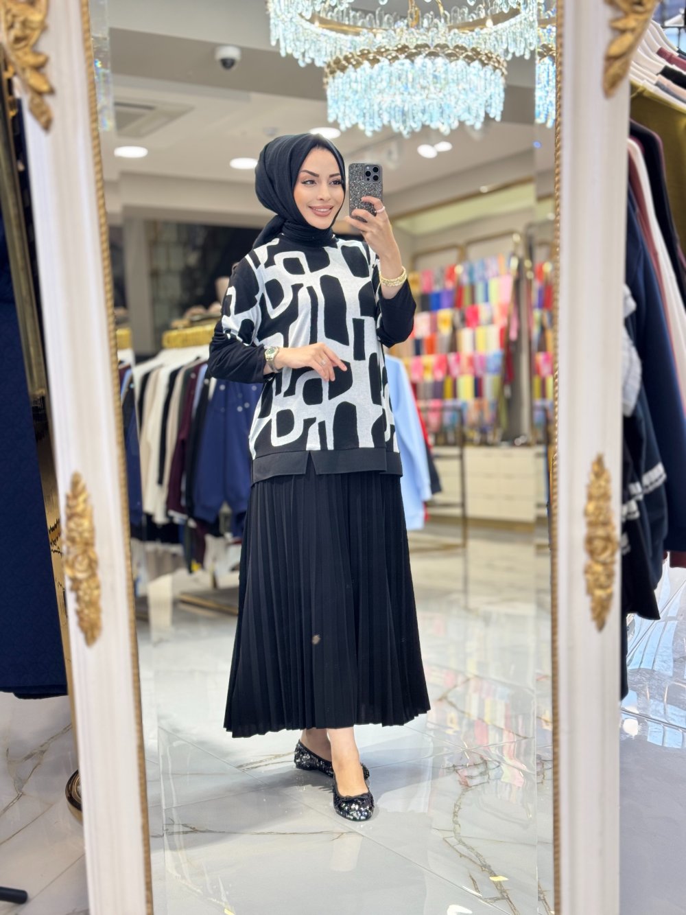 11130 Üst Geometrik Desenli Pilise Etekli Takım Siyah Gri