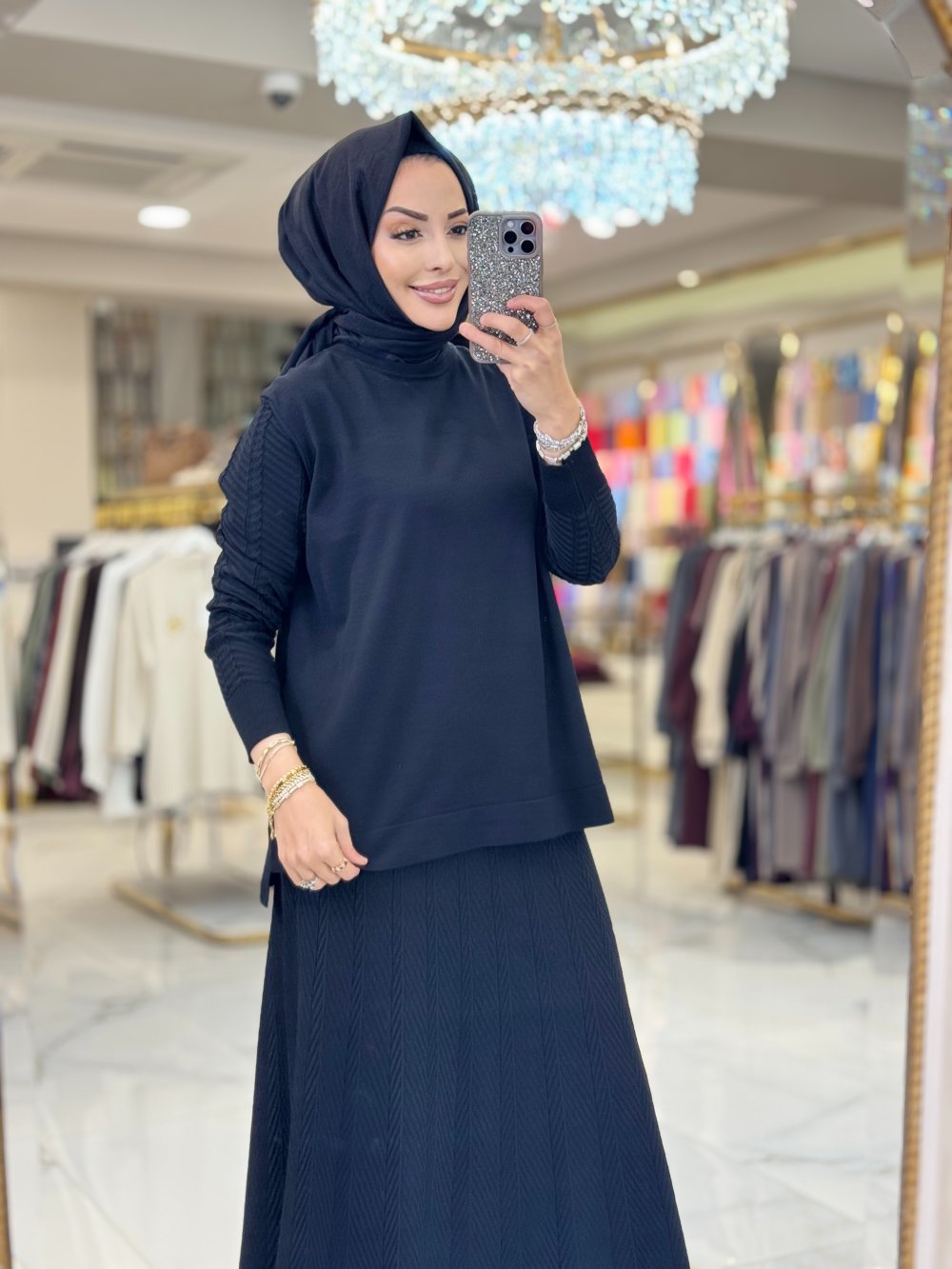 114 Etek Ve Kolu Balık Sırtı Desenli Takım Siyah