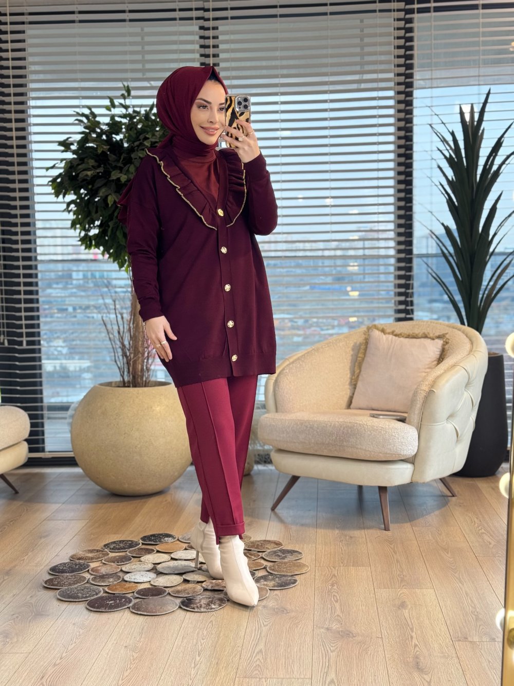 123 Yaka Kenarı Fırfır Detaylı V Yaka Hırka Bordo