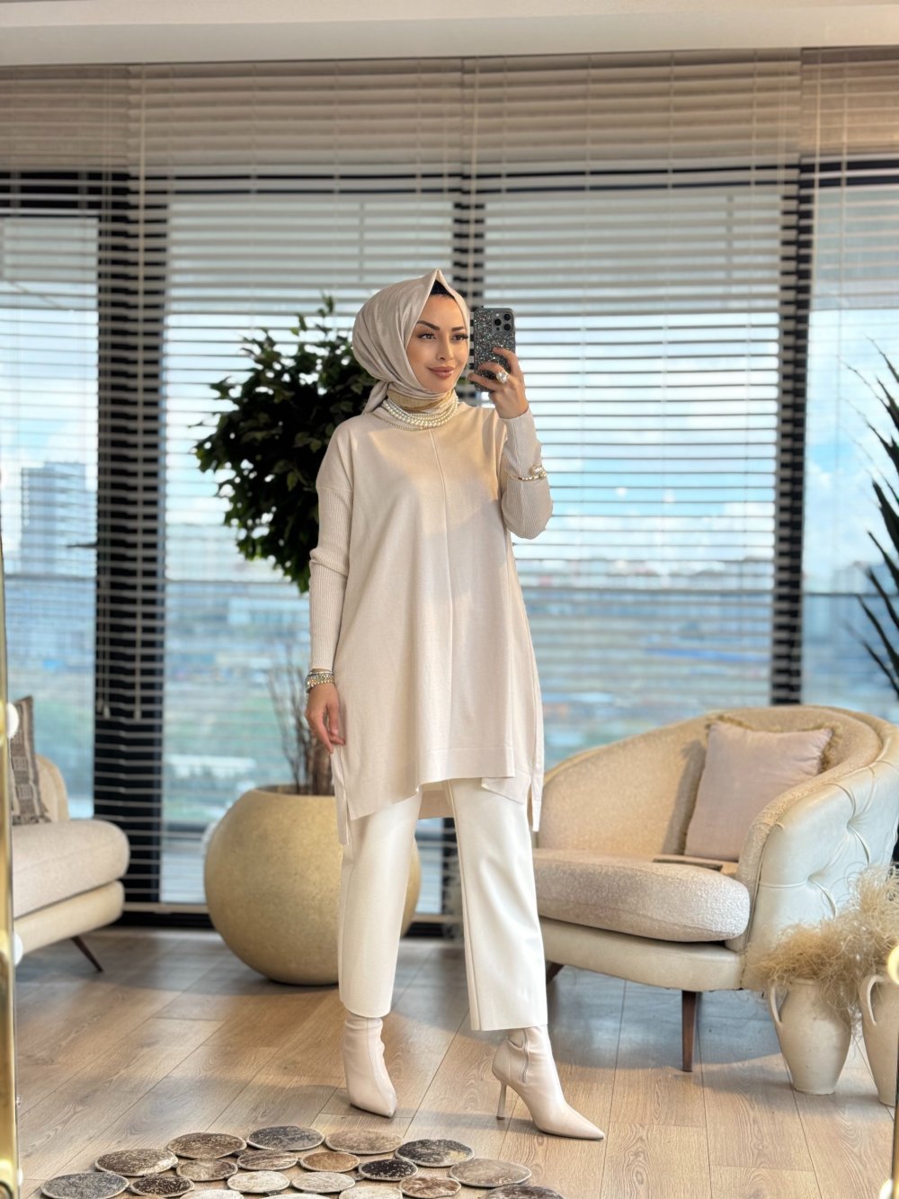 127 Kolları Lastik Örgü Triko Tunik Bej
