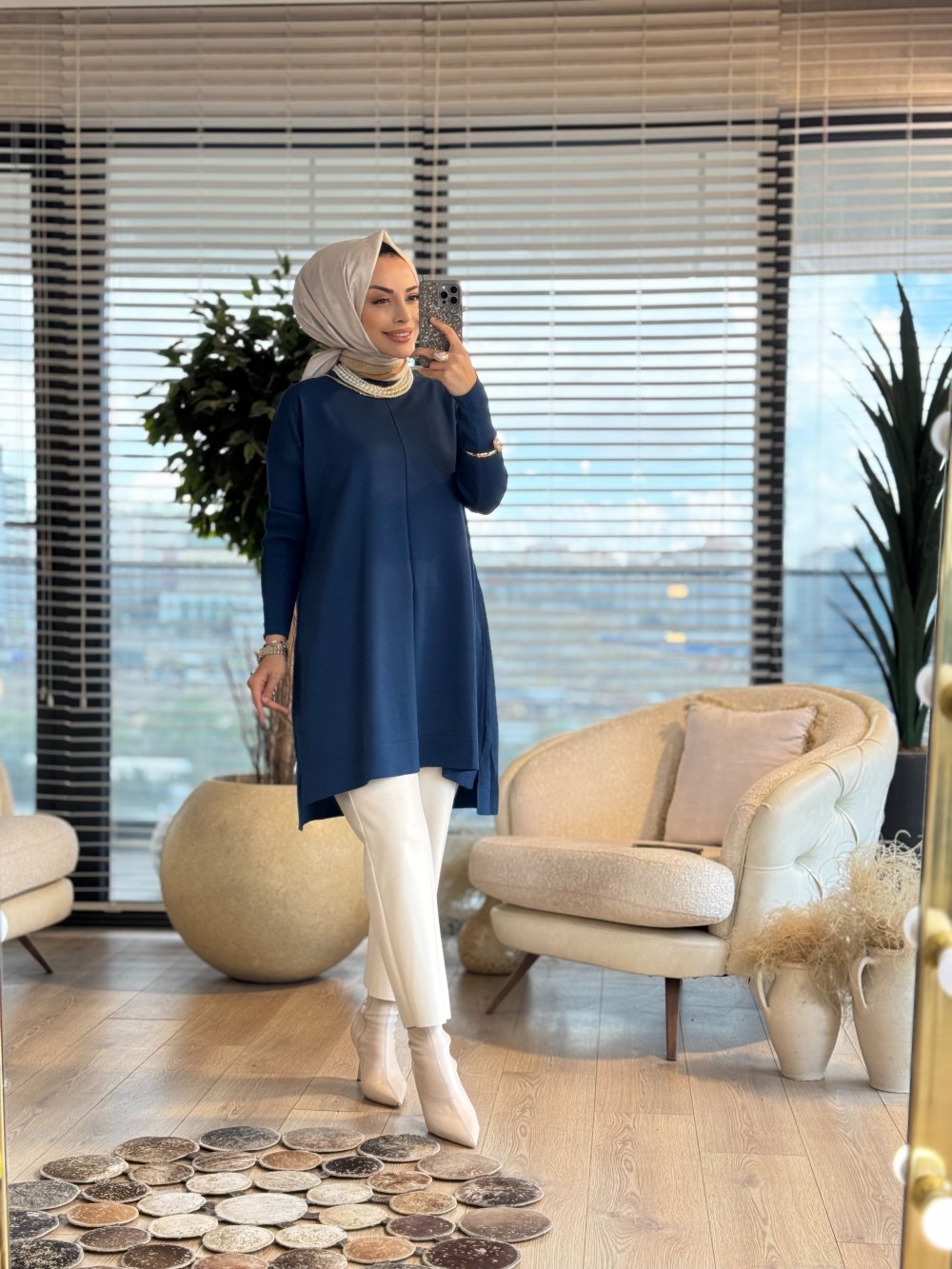 127 Kolları Lastik Örgü Triko Tunik Lacivert