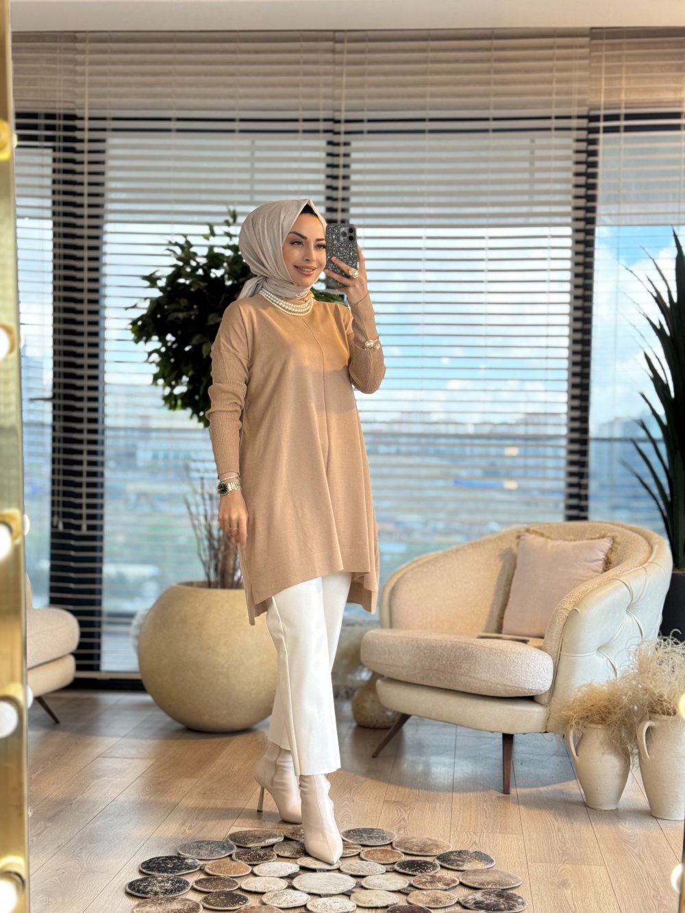 127 Kolları Lastik Örgü Triko Tunik Latte