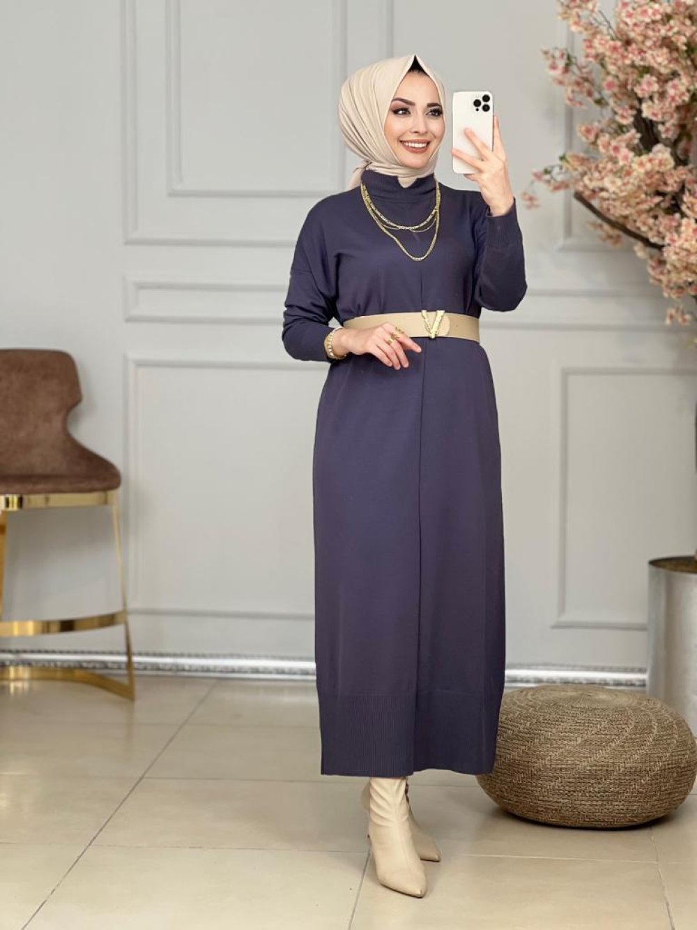 130 Önü Boyuna Çizgi Detaylı Triko Elbise Antrasit