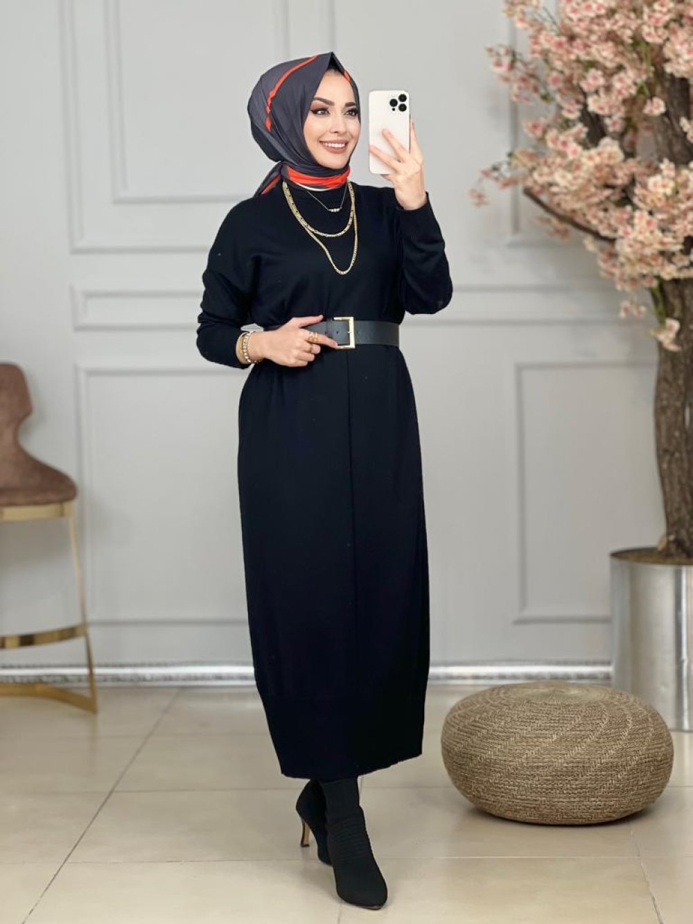 130 Önü Boyuna Çizgi Detaylı Triko Elbise Siyah