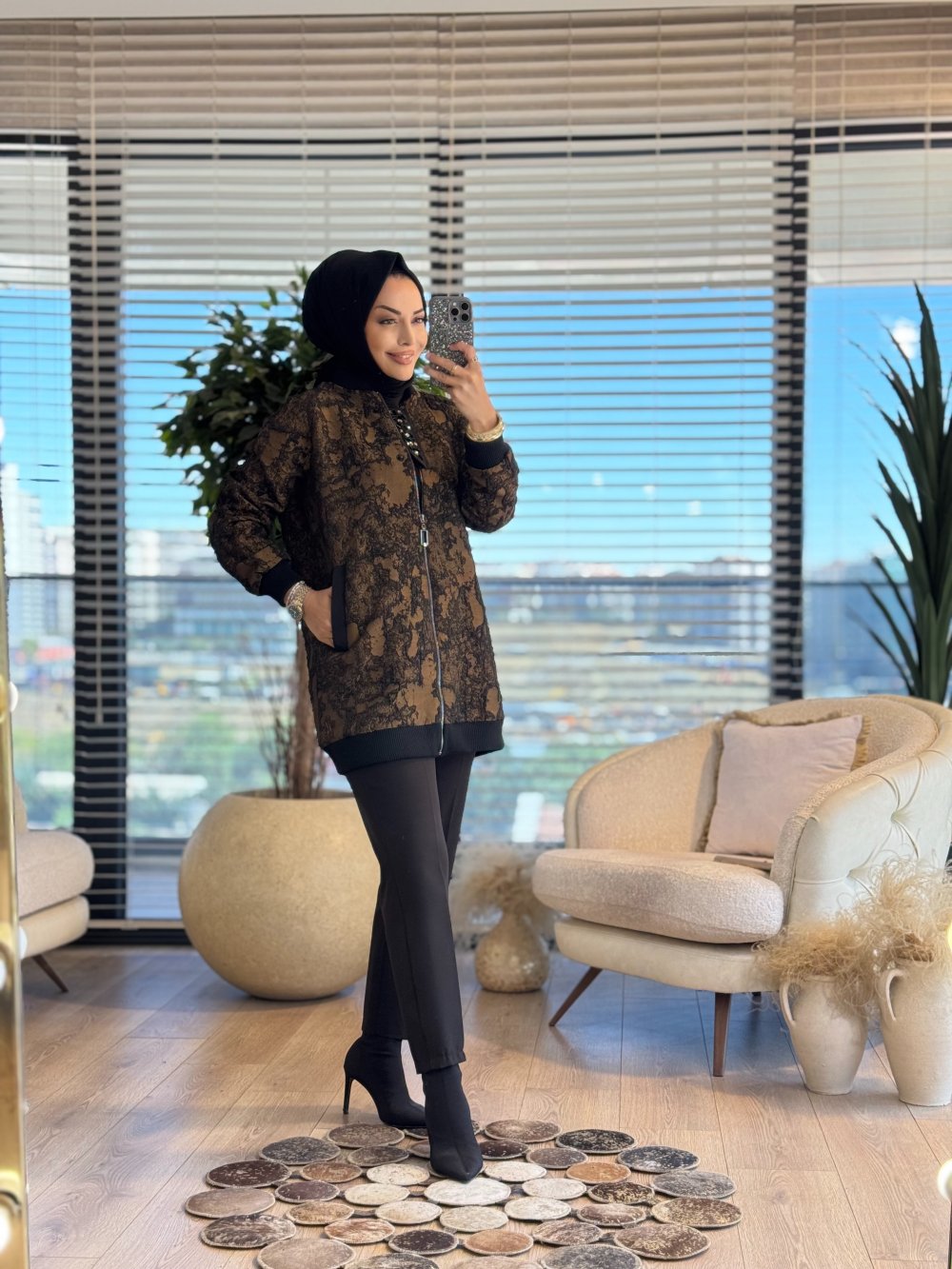 14-1161 Kabartma Desen Fermuarlı Ceket Açık Kahve