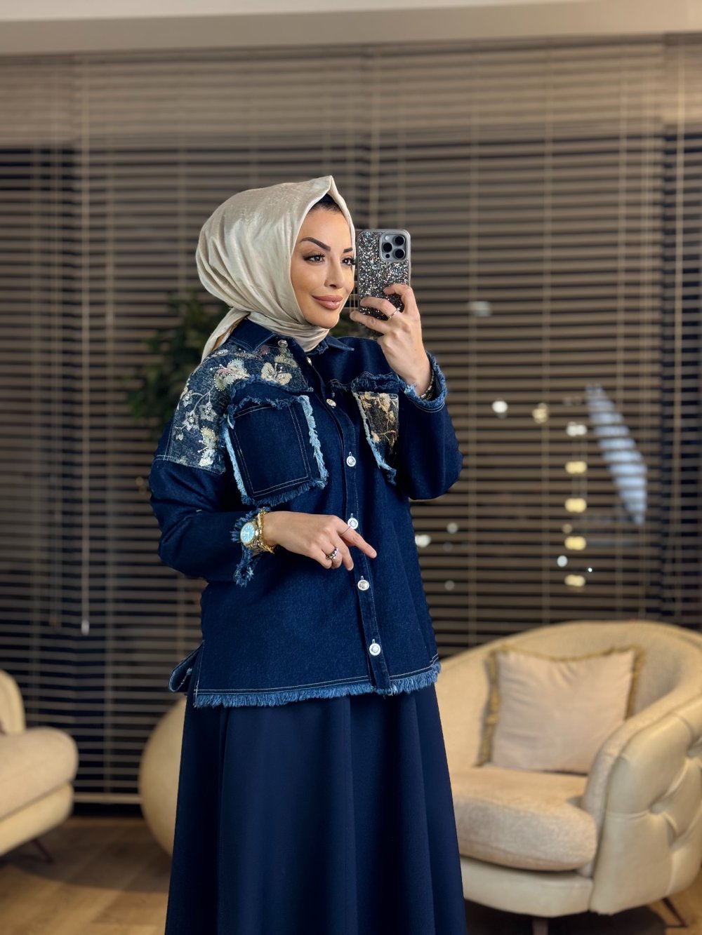 14-1168 Omuz Ve Cep Kelebek Pul İşleme Kot Ceket Lacivert
