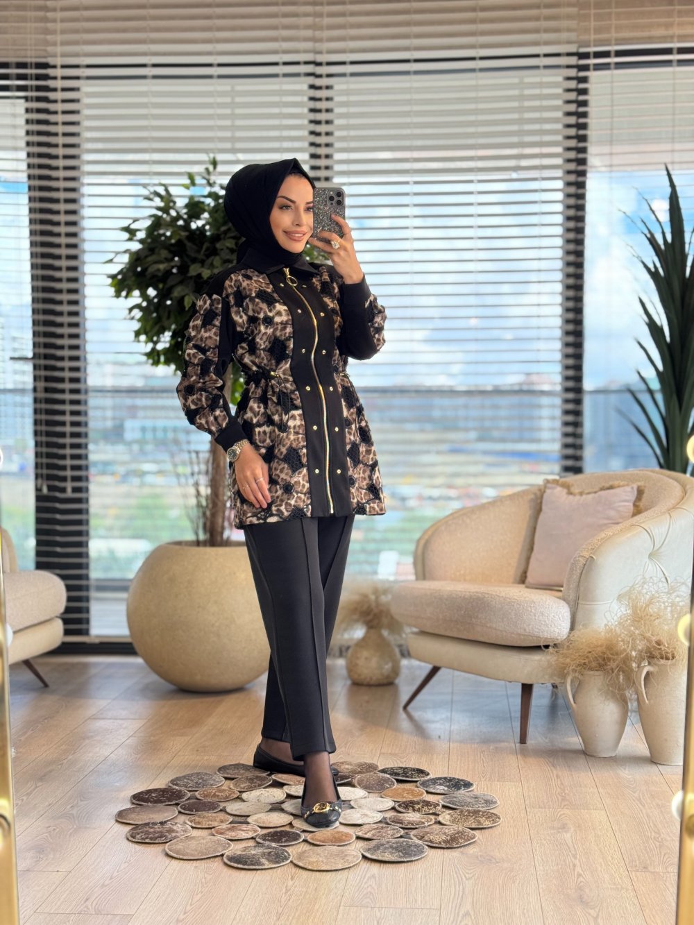 1402 Üstü Leopar Desenli Fermuarlı Takım Leopar