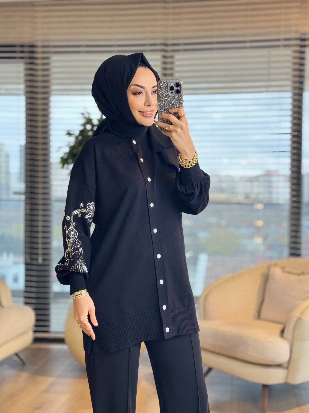 140497 Sırt Ve Kol İşlemeli Triko Hırka Siyah