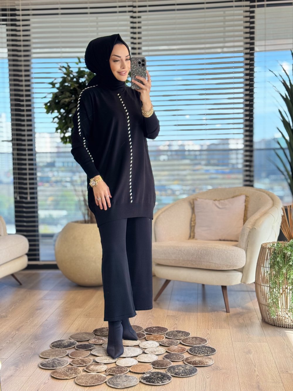 1408 Ön Ve Kolu İp Geçmeli Triko Pantolonlu Takım Siyah