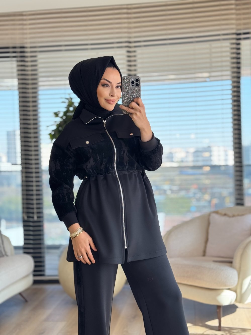 14400 Kol Ön Ve Pantolon Yanı Kadifeli Takım Siyah