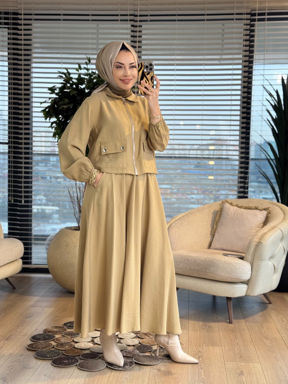 14436 Önü Cep Ve Fermuarlı Etekli Takım Yağ Yeşili
