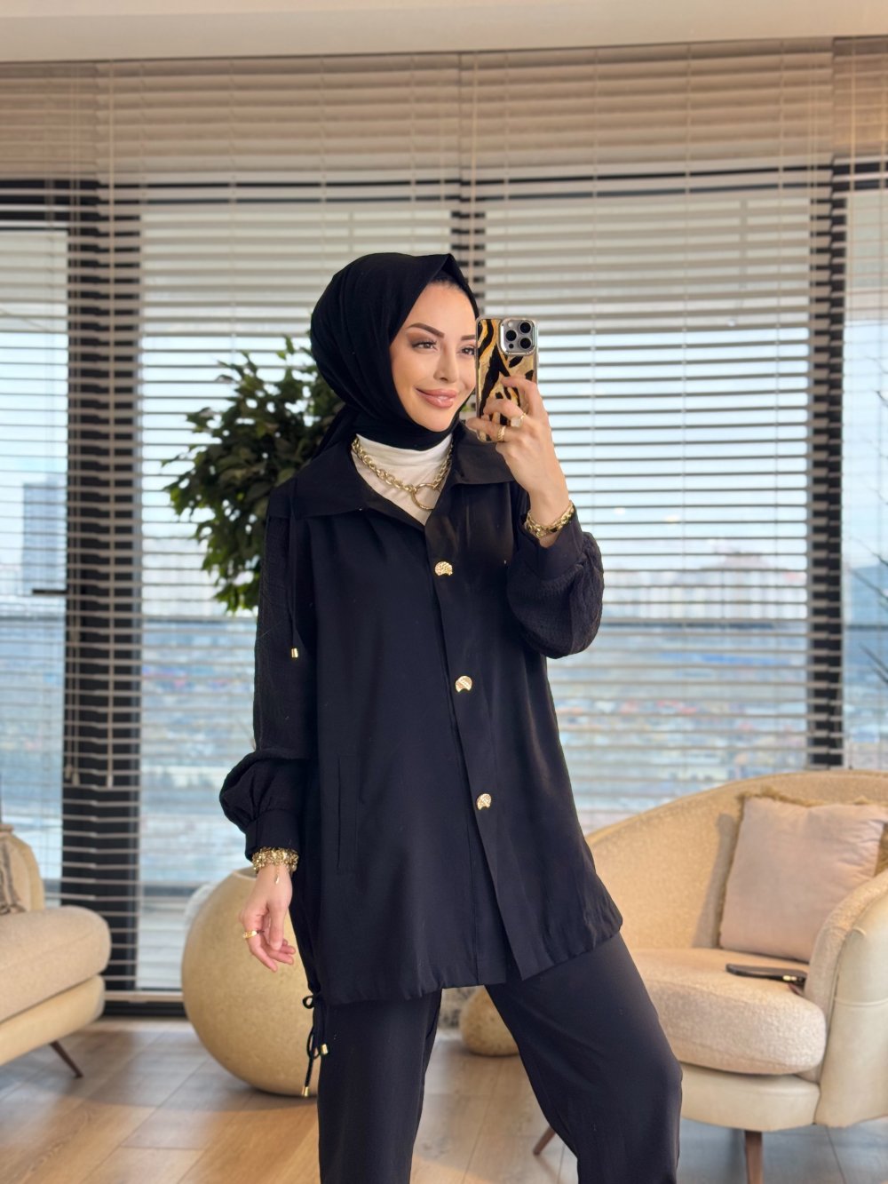 14452 Kolu Gofre Kumaş Arka Düğmeli Takım Siyah