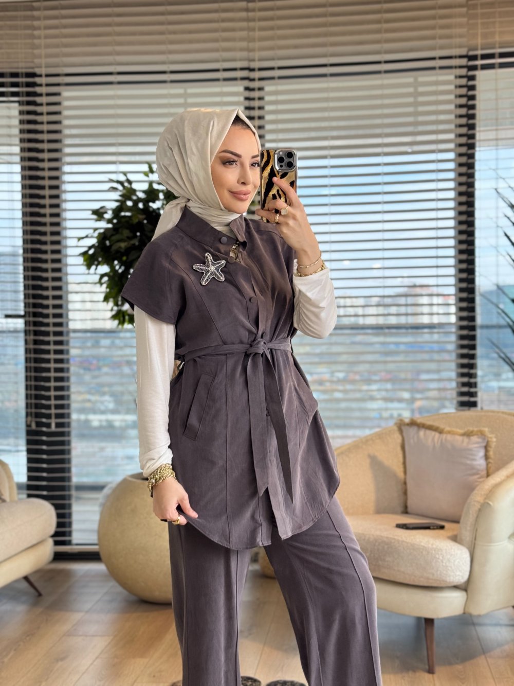 14454 Üst Yelek Ön Çıtçıtlı Broşlu Takım Kahve