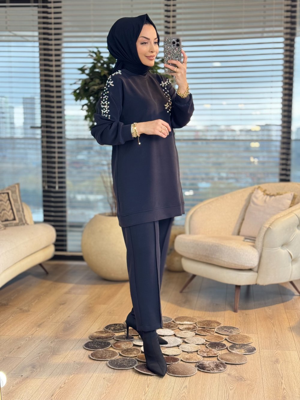 1448 Sol Omuz Ve Sağ Ön Taş İşli Takım Siyah