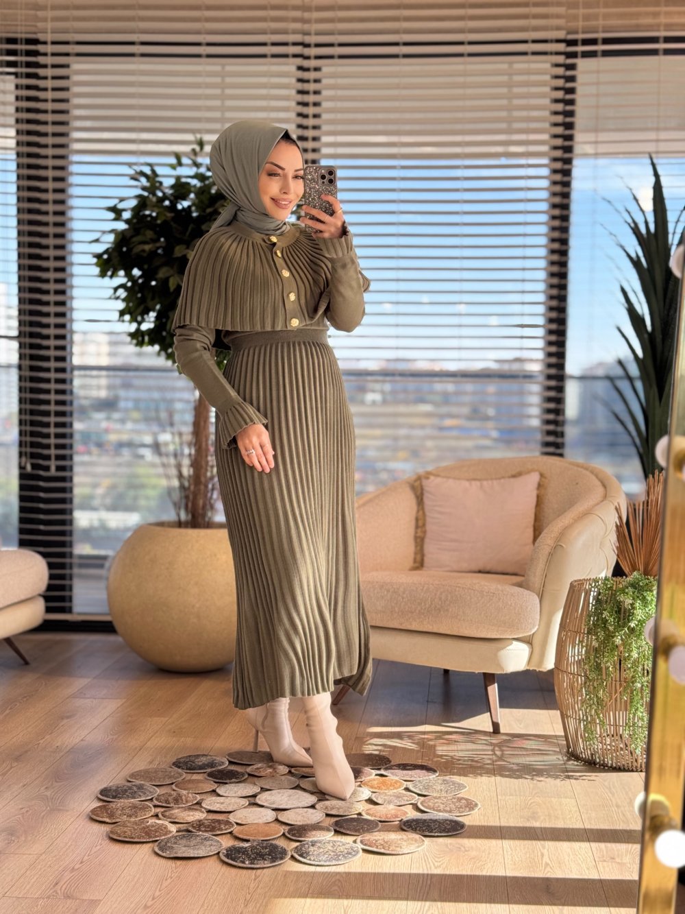 14502 Gold Düğmeli Triko Elbise 2li Takım Haki