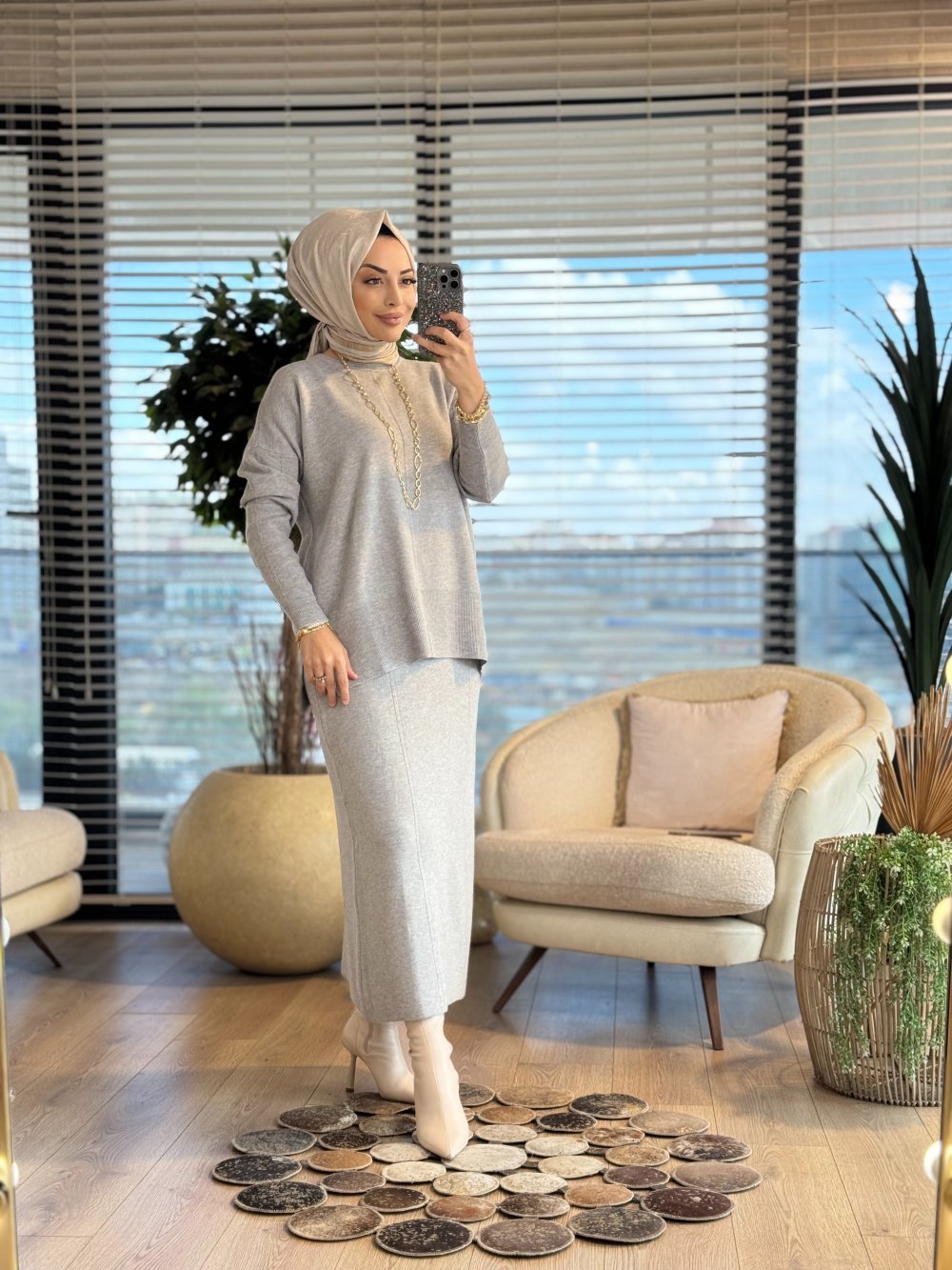 14900-1 Ön Tek Çizgili Triko Etekli Takım Gri