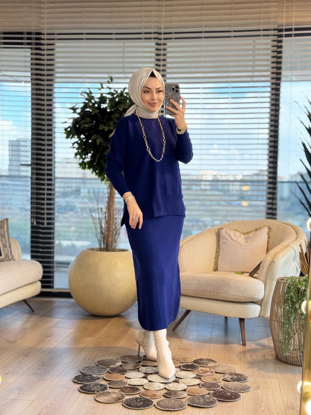 14900-1 Ön Tek Çizgili Triko Etekli Takım Lacivert
