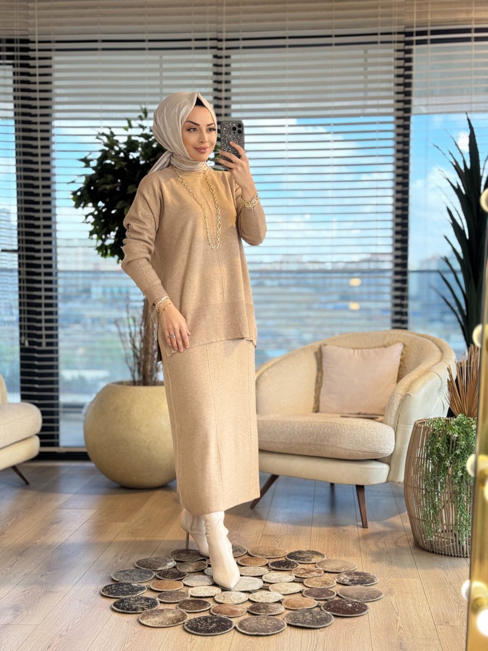 14900-1 Ön Tek Çizgili Triko Etekli Takım Latte