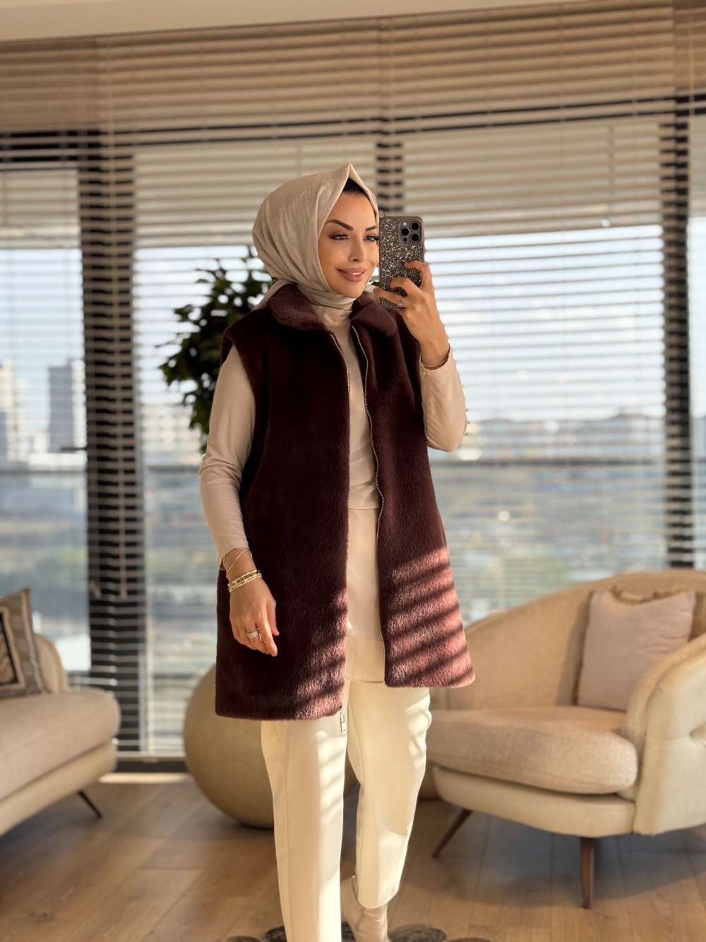 15238 Peluş Önden Fermuarlı Yelek Kahve