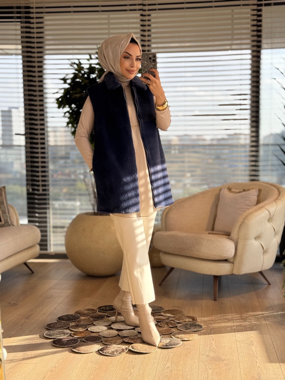 15238 Peluş Önden Fermuarlı Yelek Lacivert