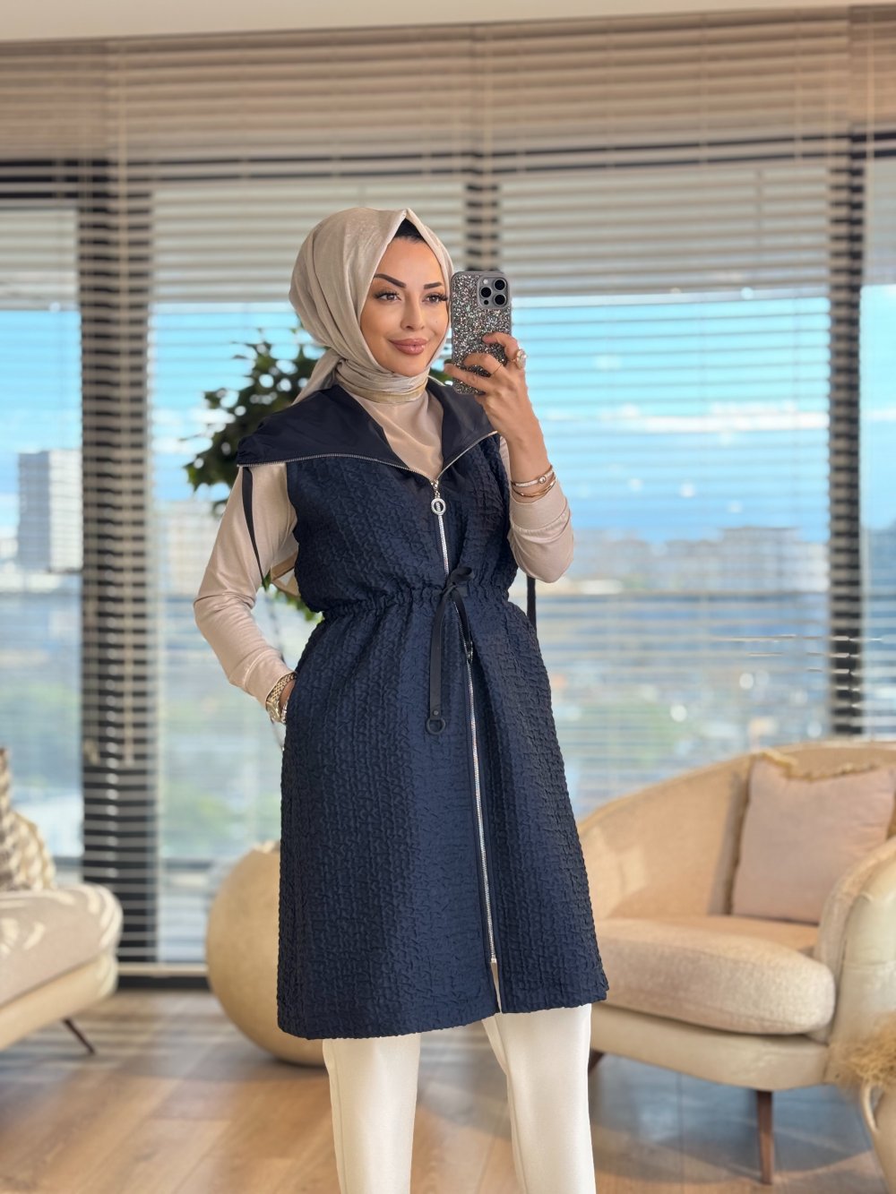 16-1119 Bürümcük Kumaş Kapşonlu Yelek Lacivert