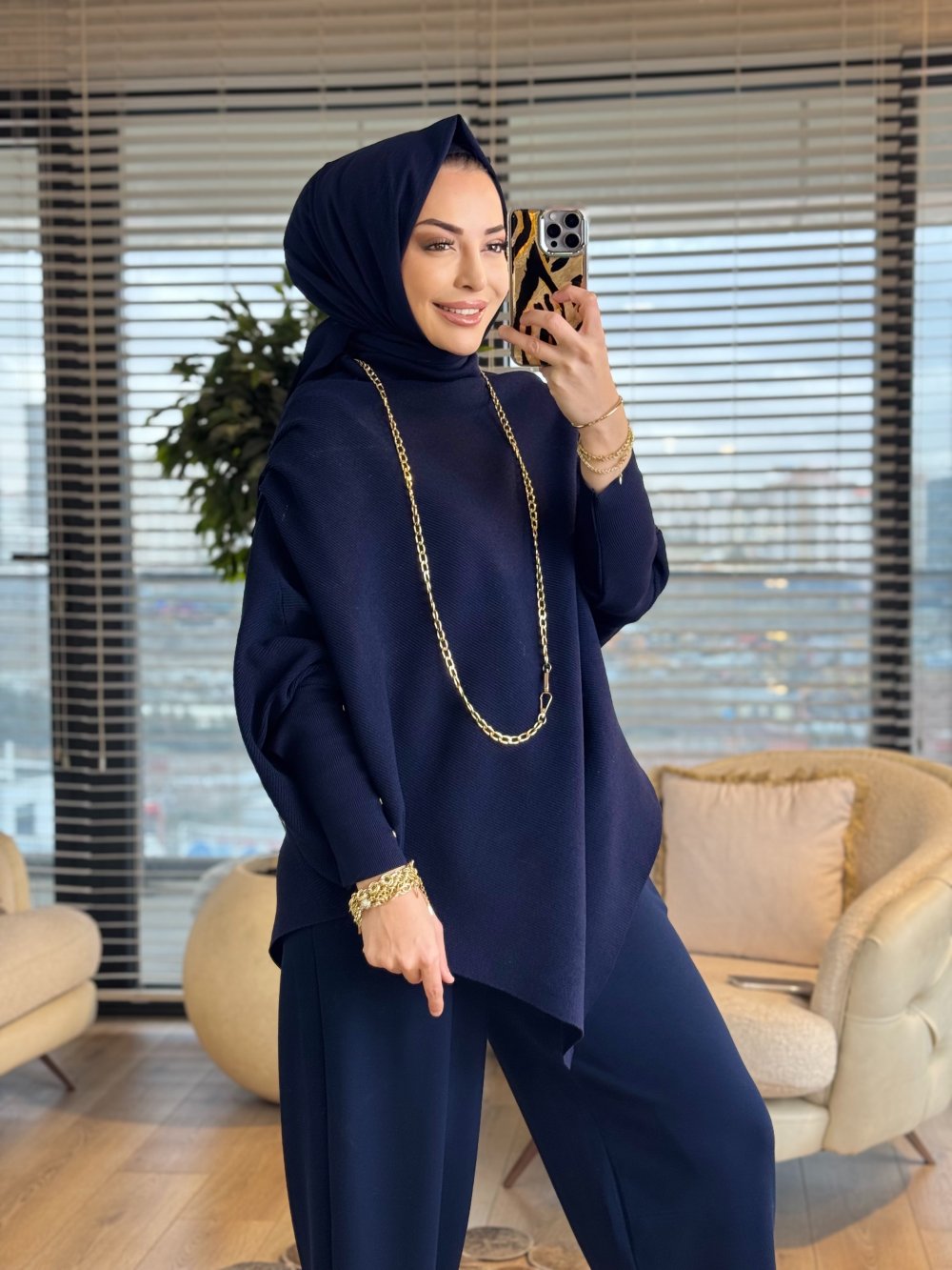 161 Asimetrik Omzu Drapeli Triko Tunik Lacivert