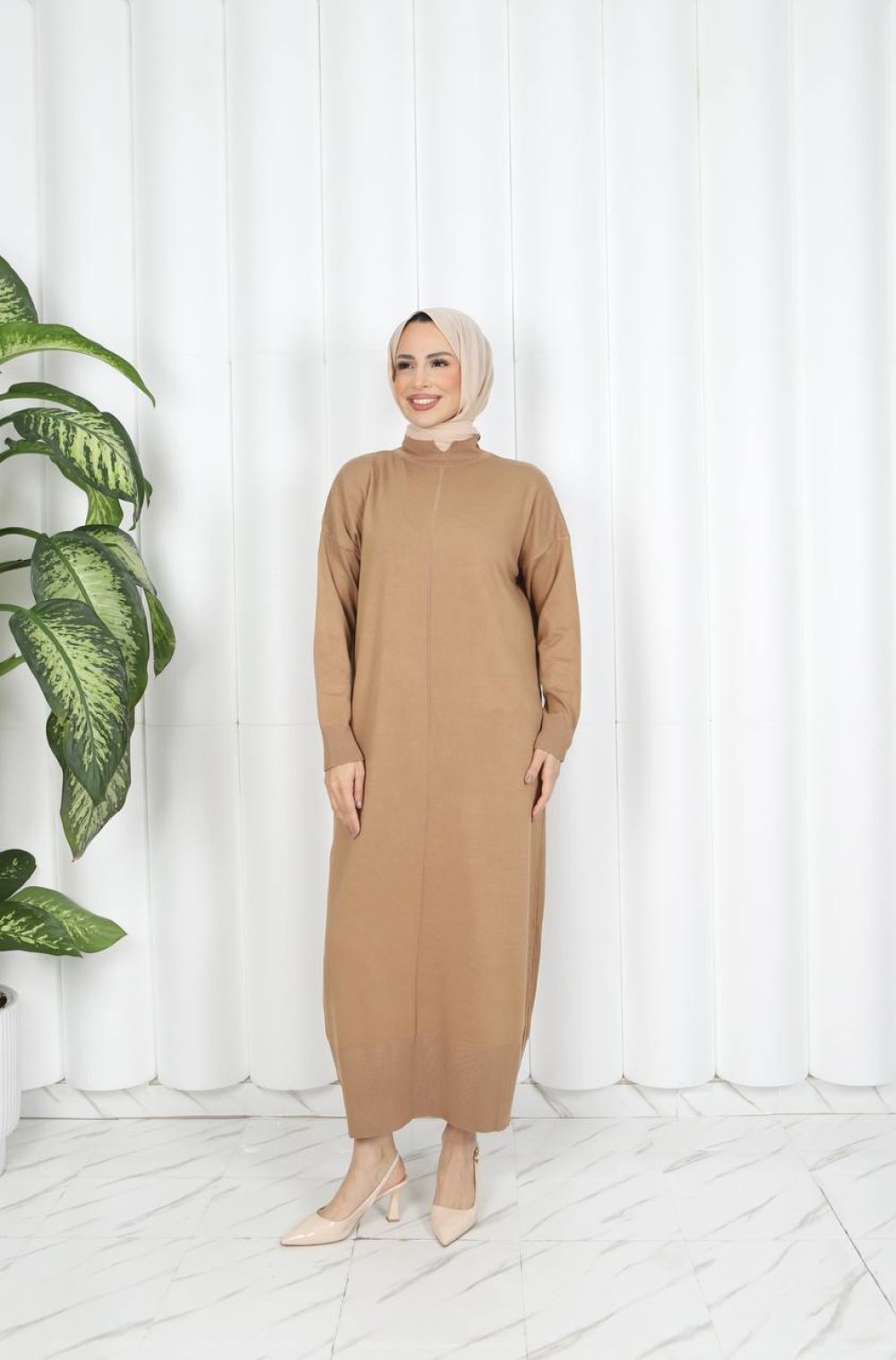 1707 önü çizgi detaylı Elbise latte Camel