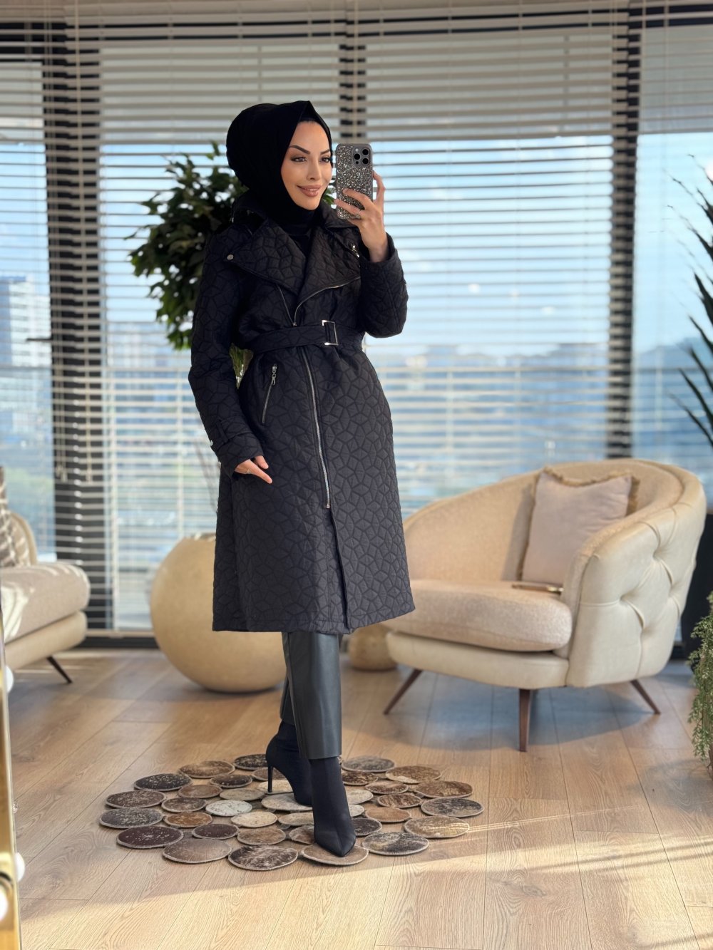 20212 Kendinden Desenli Fermuarlı Kaban Siyah