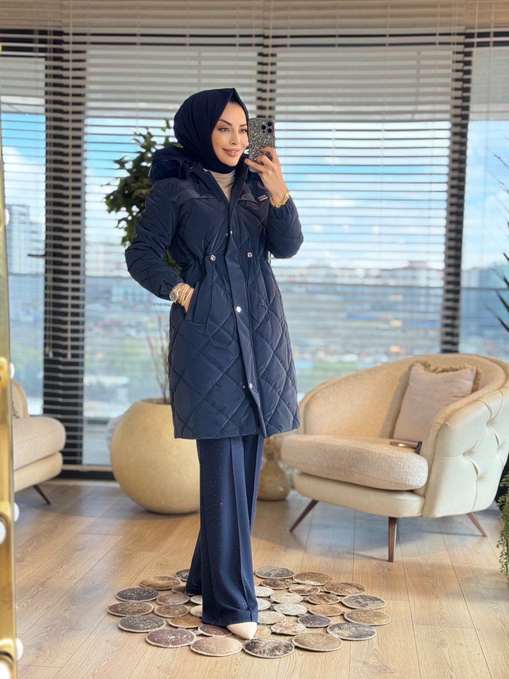 2024 Kapitone Kapş.Kürk Uzun Kaban Lacivert