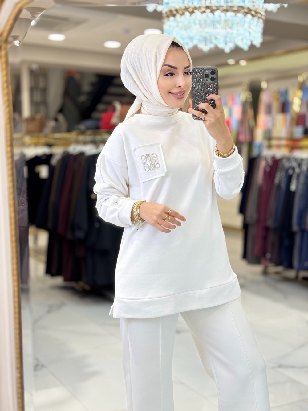 2136 Kolları Düğmeli Cebi Taş Baskılı Tunik Ekru