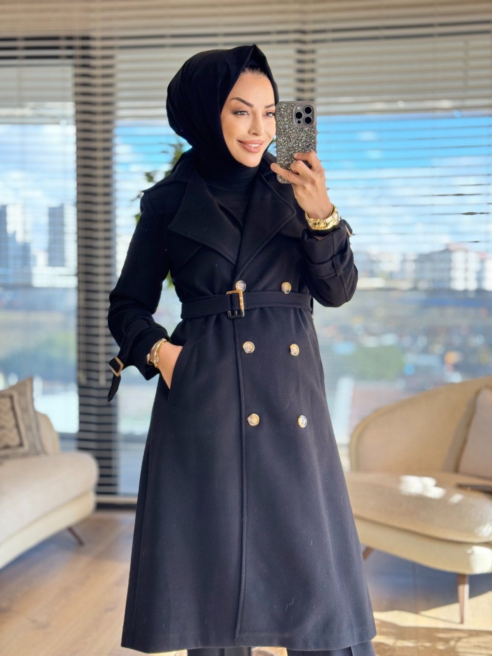2141 Kaşe Altı Düğmeli Uzun Kaban Siyah