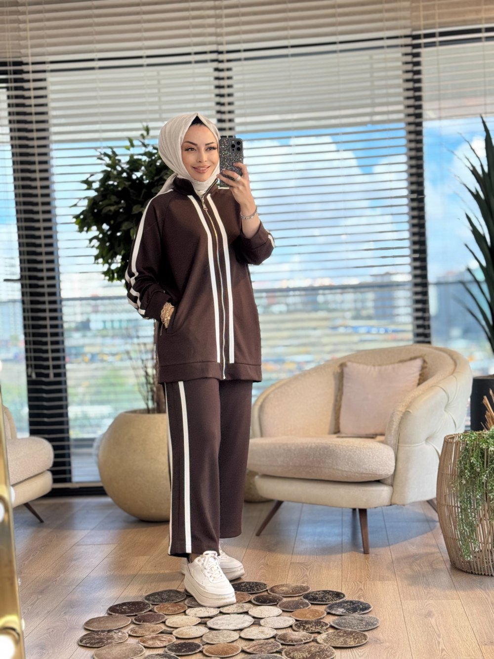 22787 Ön Kol Ve Pantolon Yanı Şeritli Takım Kahve