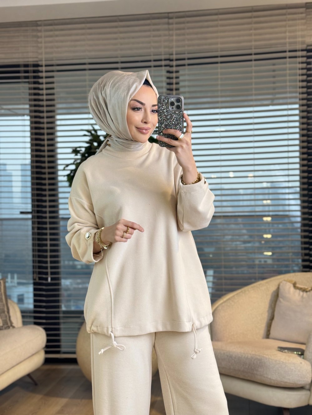 22805 Kadife Etek Ucu İpli Takım Bej