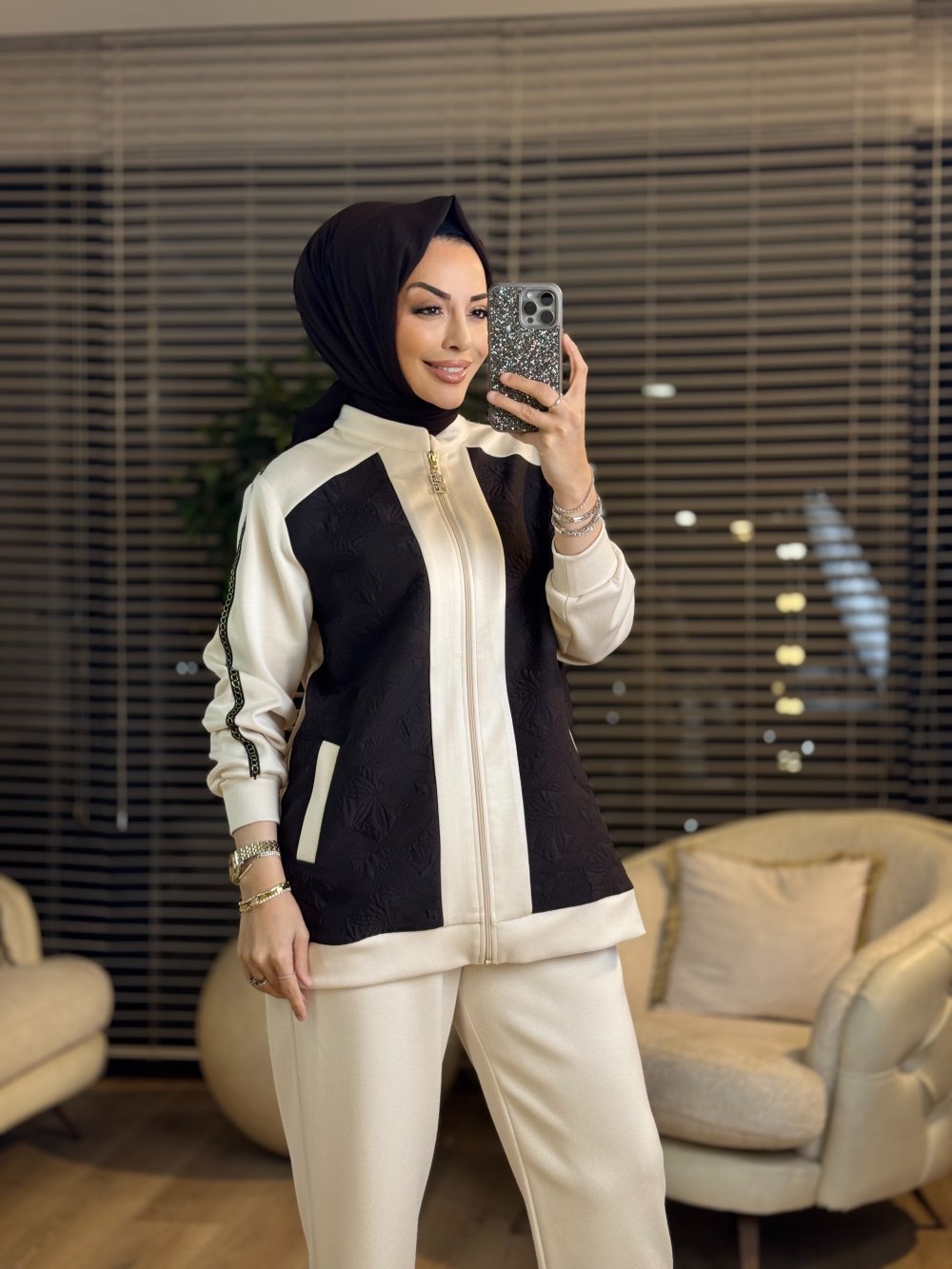 2402 Ön Kabartma Desenli Omuzları Zincirli Takım Bej
